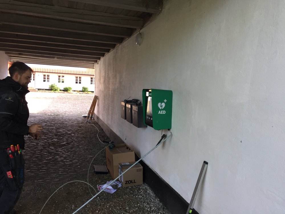 Den nye hjertestarter er opsat i porten til Lindegården, Volderslev Bygade 6 der ligger centralt i landsbyen.
